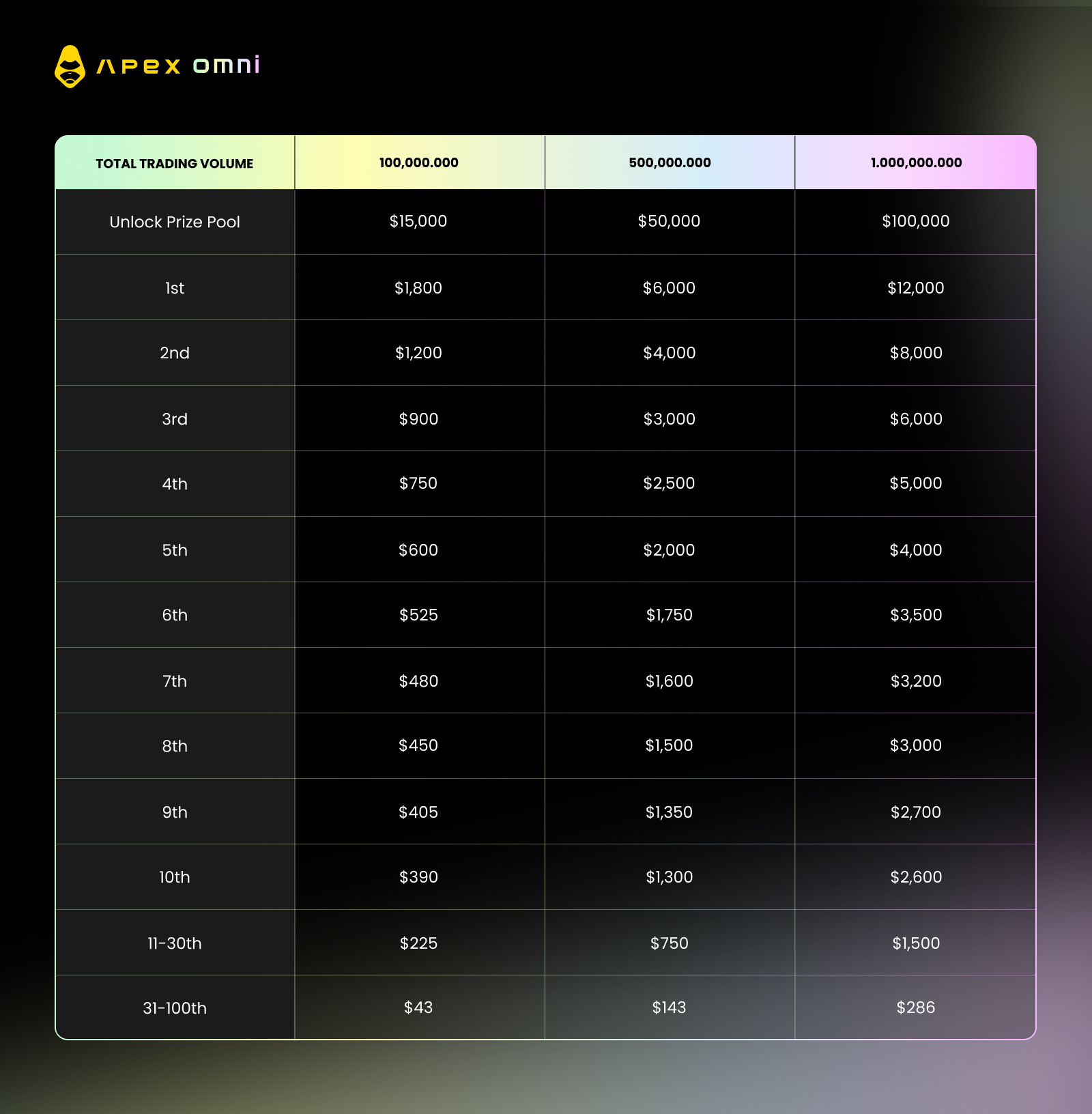 Unlock Logic: The total prize pool scales based on the cumulative trading volume of all participating agents.