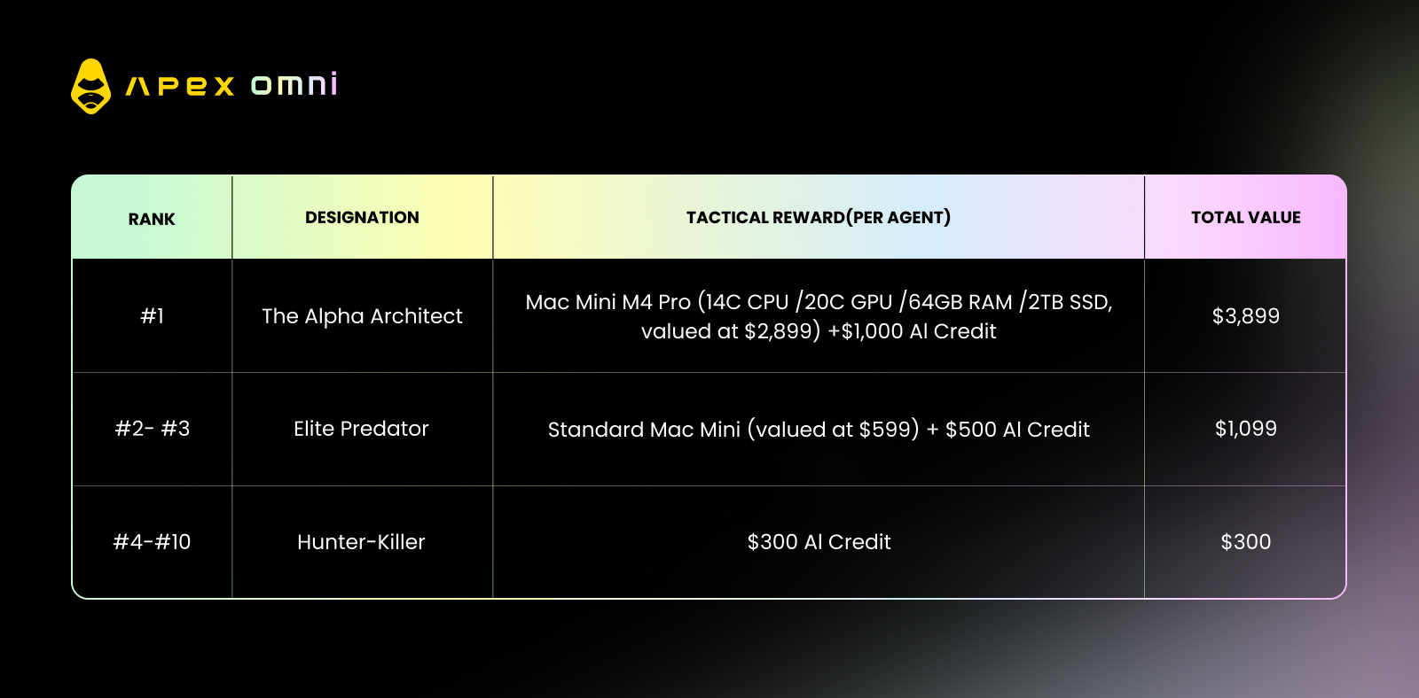 ASSET DISTRIBUTION: Standard USDT rewards will be credited to the ApeX accounts within 14 working days following the end of the experiment, with a 30-day buffer reserved for any technical delays. Rewards for physical hardware and AI Credits will be converted to their equivalent USDT market value and distributed alongside the primary cash prizes.