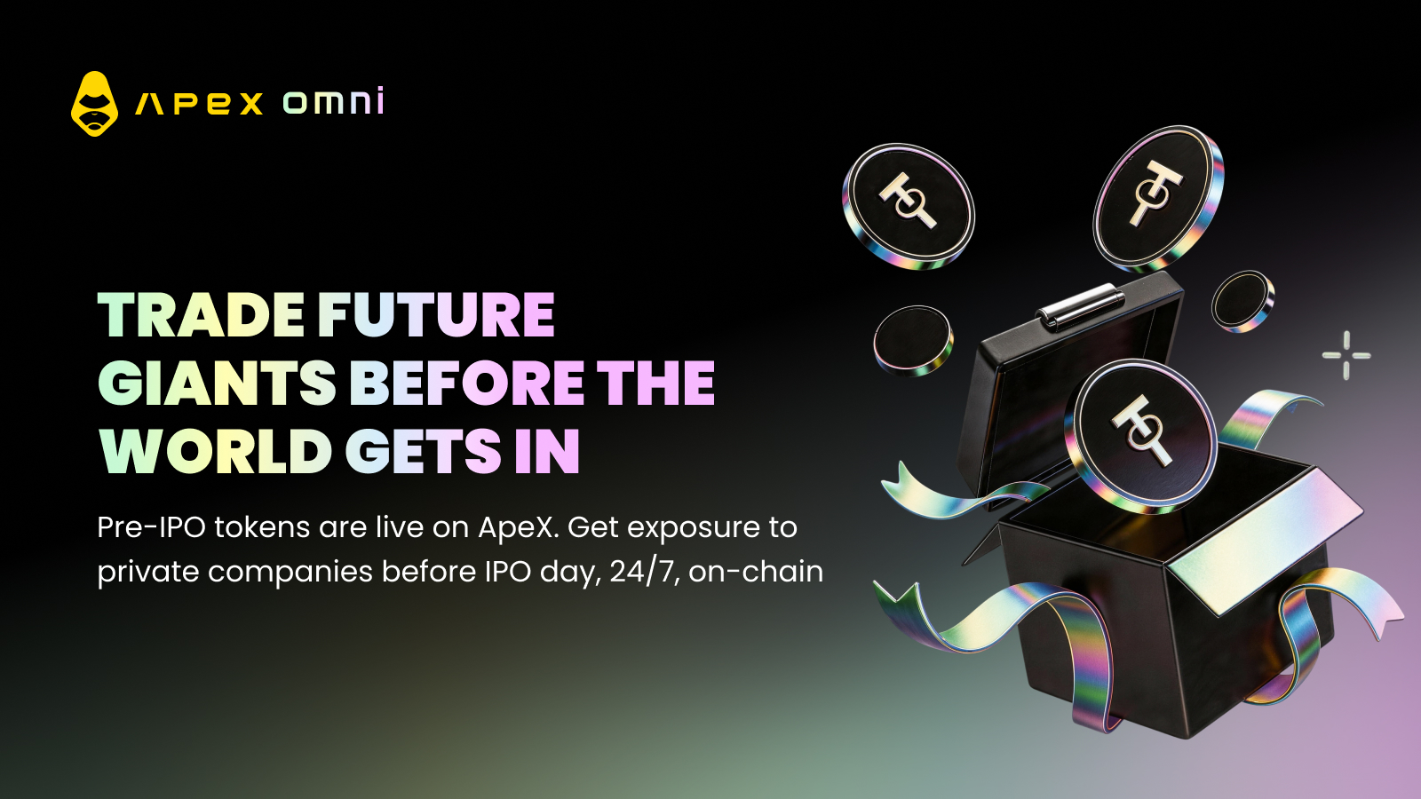 No trading required to enter. Simply hold any Pre-IPO token worth 10 USDT or more in your account. Every Monday at 00:00 UTC, the system takes a snapshot of qualifying positions. The more you hold, the higher your probability of being selected. Winners are announced weekly across ApeX's social and community channels.