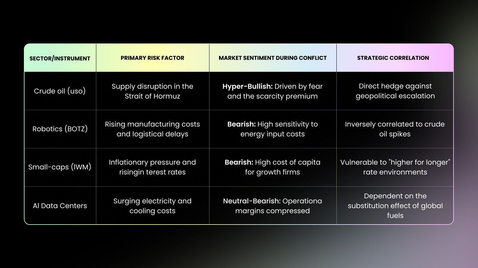 The Robotics Manufacturing Squeeze: For sectors like robotics (BOTZ), the impact is two fold. These industries require energy intensive fabrication of precision hardware and the transport of complex components across vulnerable maritime routes. When fuel prices spike, the "cost to build" increases, slowing down the iteration and deployment cycles of physical automation.