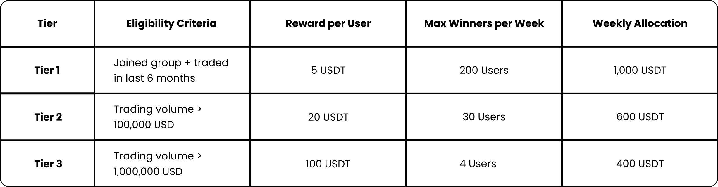 Each week, approximately 2,000 USDT in bonuses will be distributed across these tiers. Rewards operate on a first come, first served basis within each tier, so early participation gives you the best chance to claim your reward.