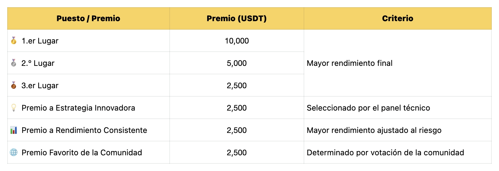 Para impulsar la competencia, cada participante calificado recibirá 5.000 USDT de capital inicial. El objetivo es simple: lograr los mayores rendimientos y dominar los mercados para reclamar tu parte del premio total de 25.000 USDT. ¡Aquí es donde el código se encuentra con la gloria!