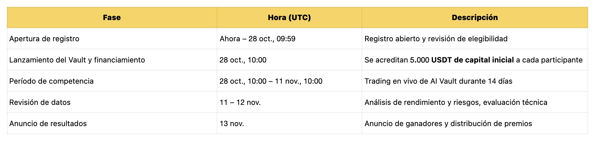 La participación está abierta a individuos o equipos que cumplan con los requisitos de registro de ApeX. Cada participante solo puede operar un AI Vault. Al unirse, los participantes aceptan y se comprometen a cumplir todas las reglas y políticas del evento.
