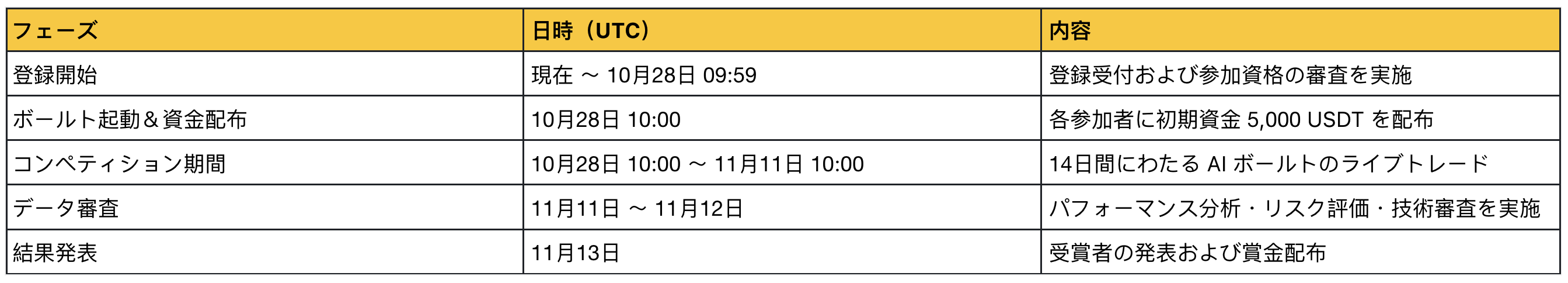 参加資格:参加資格は、ApeXの登録要件を満たす個人またはチームに限られます。各参加者は 1つのAI Vault のみを運用することができます。コンペティションへの参加をもって、すべてのイベントルールおよびポリシーに同意したものとみなされます。