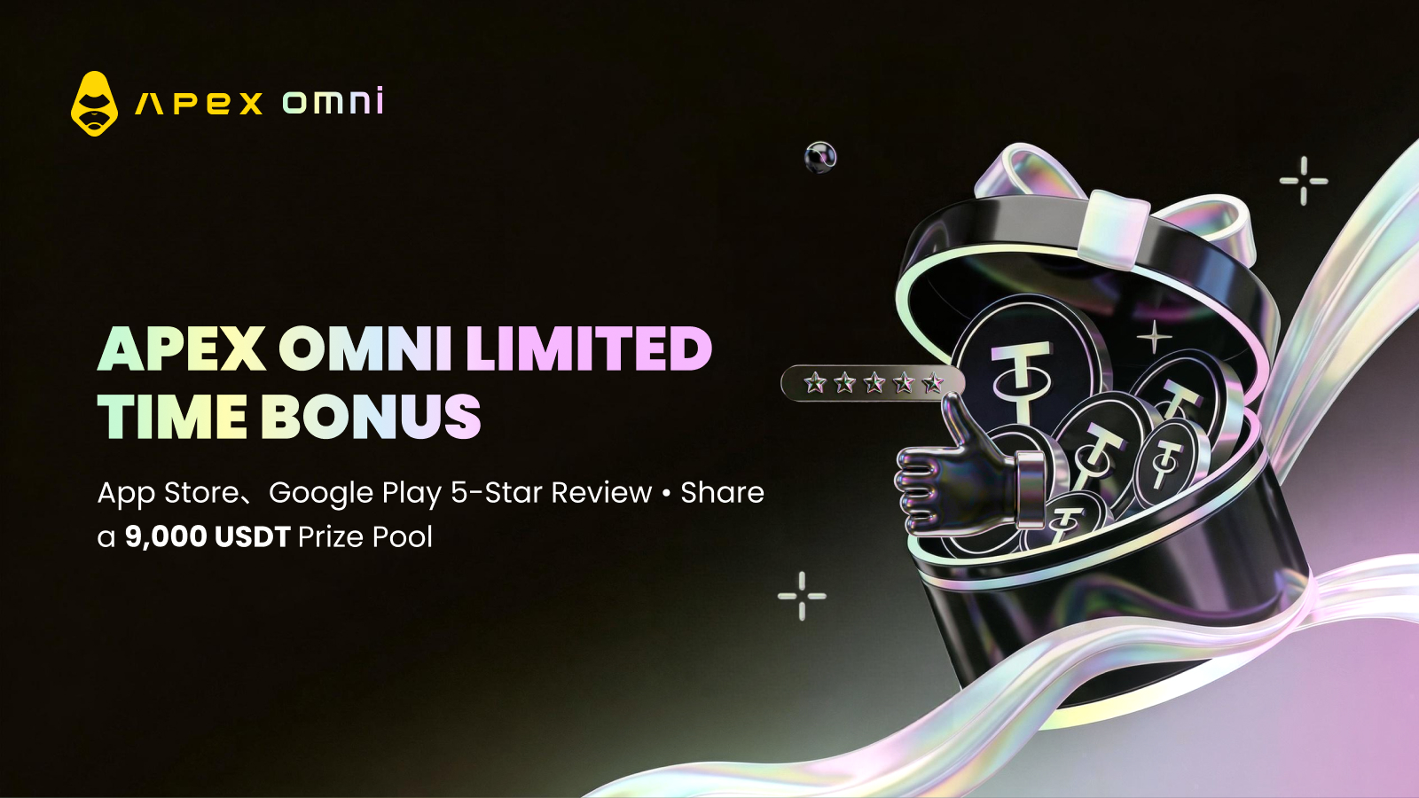 ユーザーの皆様の長期にわたるご支援に感謝し、ApeX Omni は App Store・Google Play にて星 5 つのレビュー特典キャンペーンを正式に実施いたします。レビューを投稿いただくと、取引手数料割引、プラットフォームポイントなど豪華特典をプレゼント!