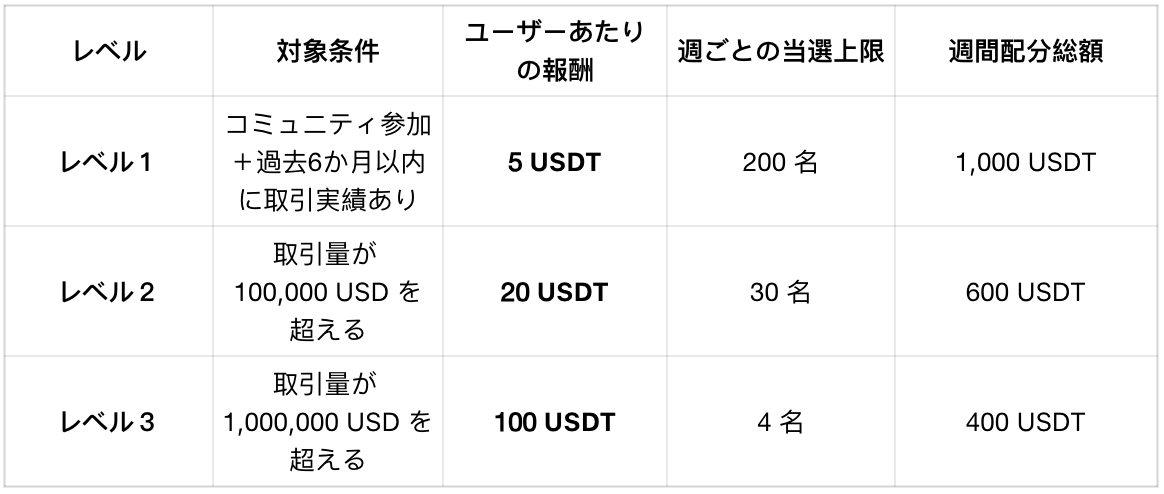 毎週およそ 2,000 USDT のボーナスが、以下のティアごとに分配されます。 各ティア内での報酬は先着順で付与されるため、早めの参加ほど報酬を獲得できる可能性が高まります。