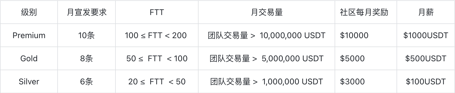薪资构成比例:交易量占比50%;FTT 占比20%;宣发占比30%;FTT 低于 20 不足以获得基本工资。连续两个月持续未达到最低要求将导致终合作。