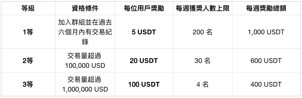 每週將發放約 2,000 USDT 的獎金,依據不同等級分配。 獎勵採「先到先得」的方式發放 —— 越早參與、越有機會獲得獎勵。